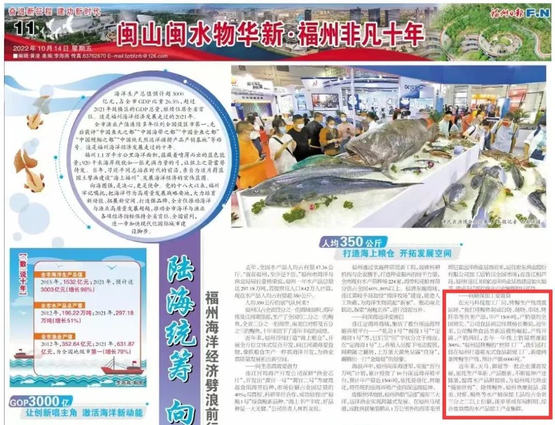 天馬科技訊 10月14日,福州日報刊登專版報道《閩山閩水物華新 福州非凡十年》,報道了天馬科技集團布局鰻魚食品全產業鏈,以高品質預制菜向精深加工要效益,引領國鰻崛起,引發了社會的廣泛關注。報道如下↓↓↓